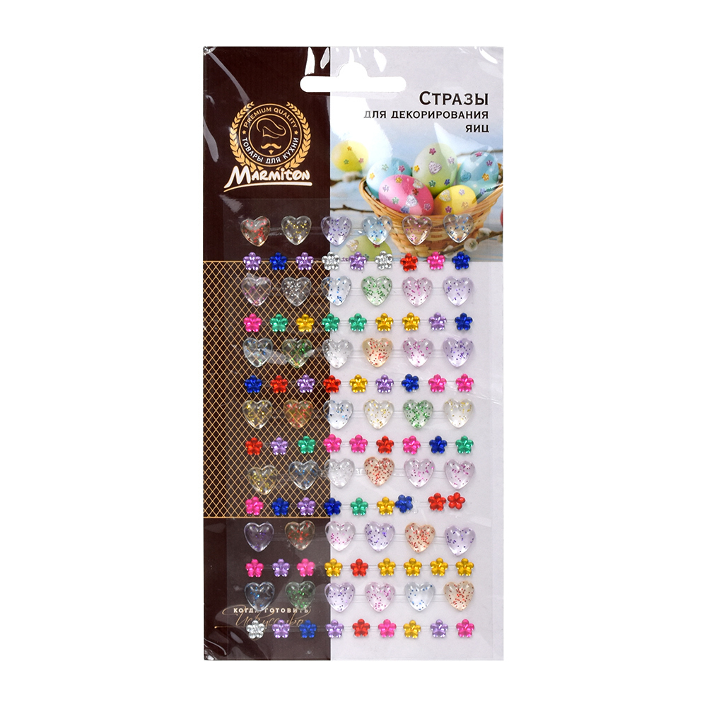 Способ применения: 1. Подготовить яйцо - отварить его, остудить и высушить. 2. Отделить стразы от основы и поместить на яйцо. 3. Плотно прижать.