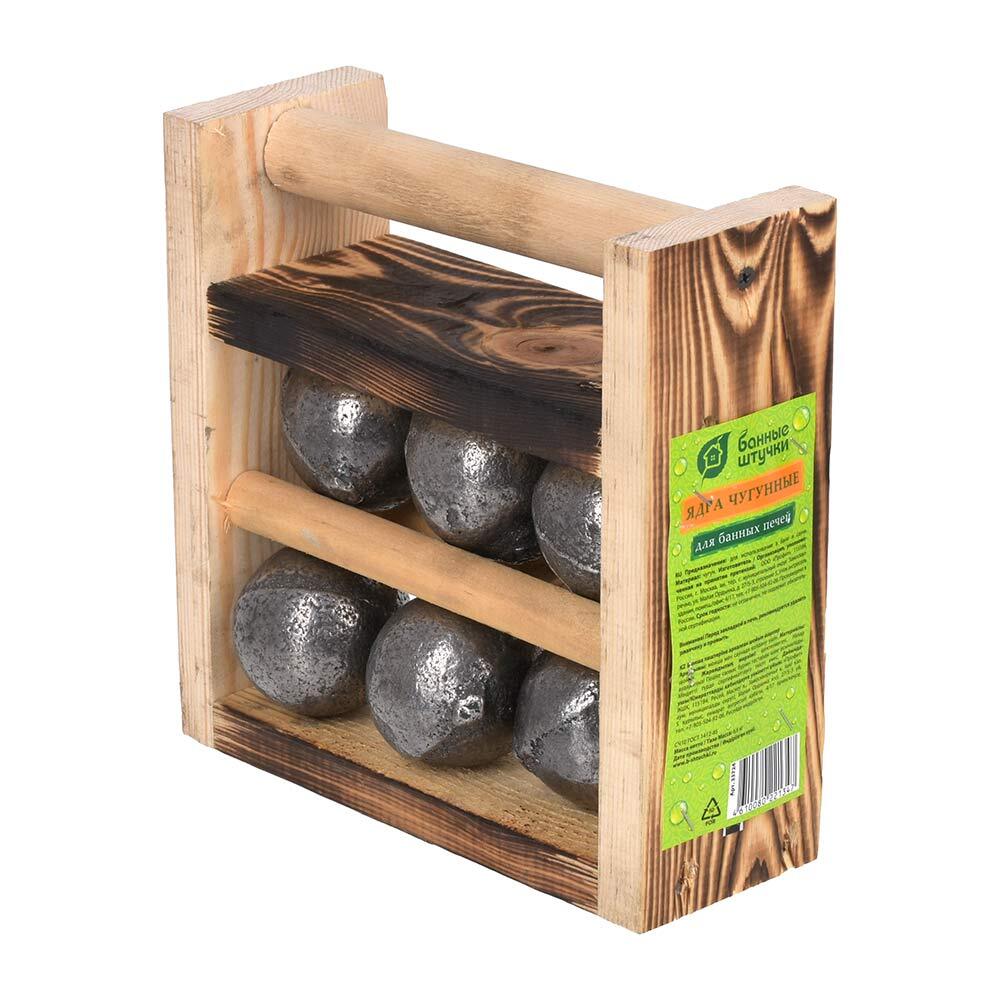 Описание: Чугунные ядра, издревле используютсяся в банной печи. Теплоемкость чугуна на 15% выше, чем у камня, а теплопроводность - больше в 30 раз, именно поэтому его рекомендовано использовать в смеси с природными камнями для бани, которые, в свою очередь, обеспечат вашей бане оздоровительные свойства и неповторимый аромат. Чугунные ядра не трескаются и не рассыпаются при резких перепадах температур. Чугун очень быстро набирает тепло. Вид индивидуальной упаковки: деревянный короб.