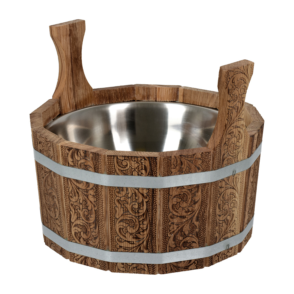 Описание: Бондарные изделия из дуба славятся высокой прочностью. Для древесины дуба характерна высокая устойчивость к влаге, что очень важно для изделий, которые используются в банных процедурах. Бондарные изделия с ажурными узорами – это идеальное качество, имитирующее ручную резьбу, а одинаковые симметричные рисунки создают эффект коллекционного раритета.